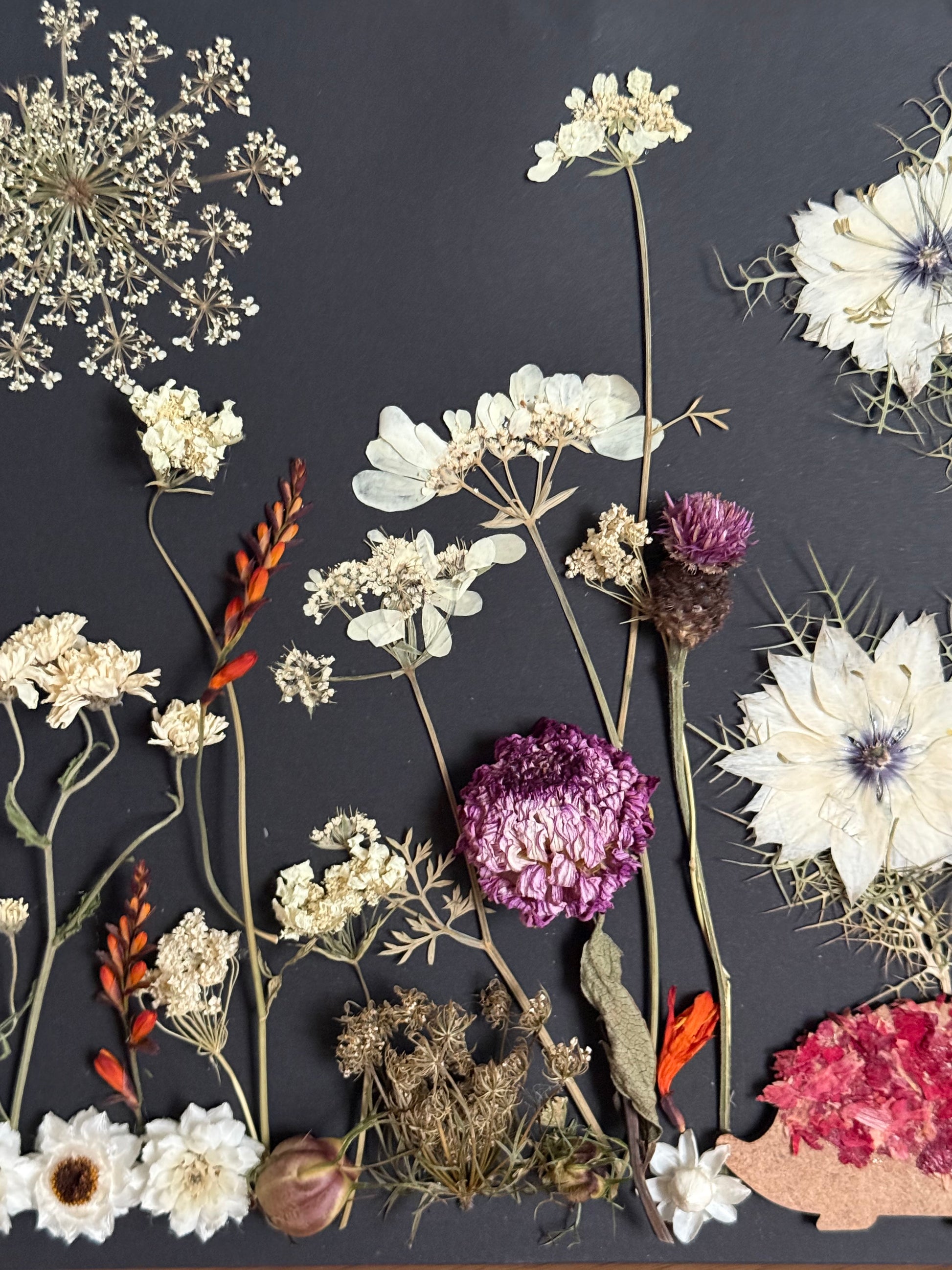 Each flower has been carefully grown in our Scottish flower field, hand-pressed and arranged to create a three-dimensional artwork that brings depth, texture, and a touch of wildlife magic to your home. Presented in a black frame (23cm x 23cm) against a dramatic black background, this piece tells a story of nature, rescue, and the quiet beauty of a summer evening.