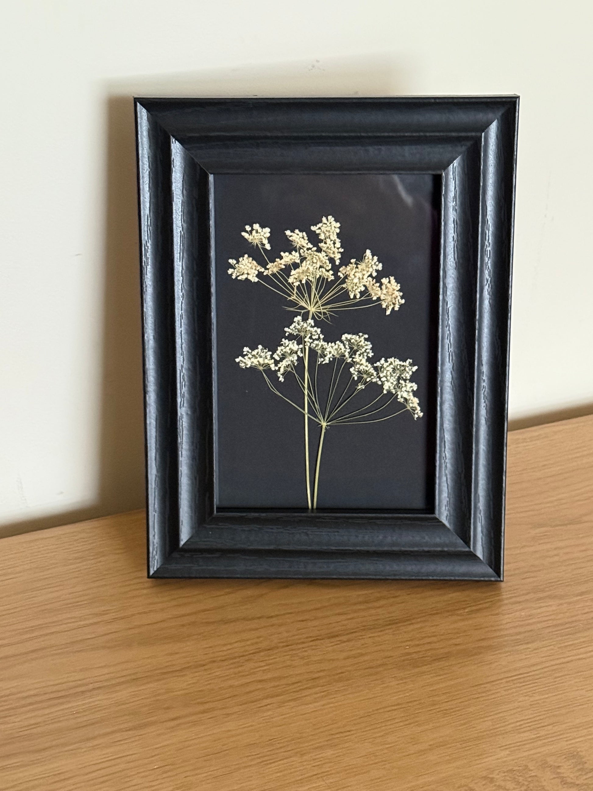 A simple, minimalist pressed flower artwork showcasing the intricate detail of the beautiful, romantic and delicate Ammi flower.