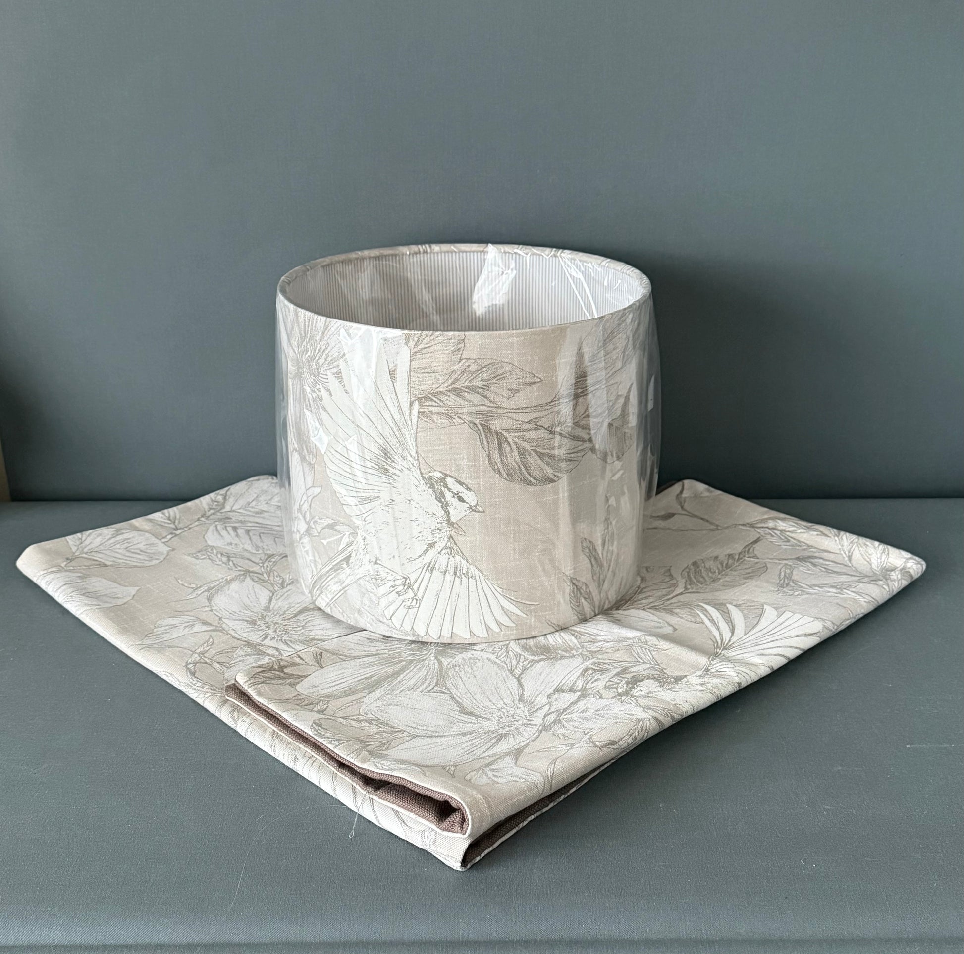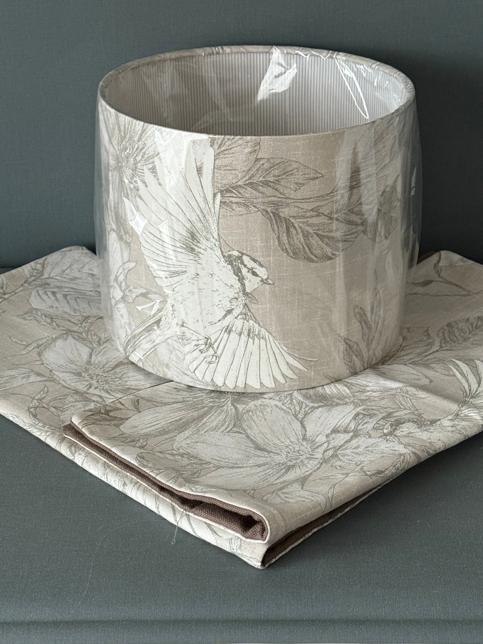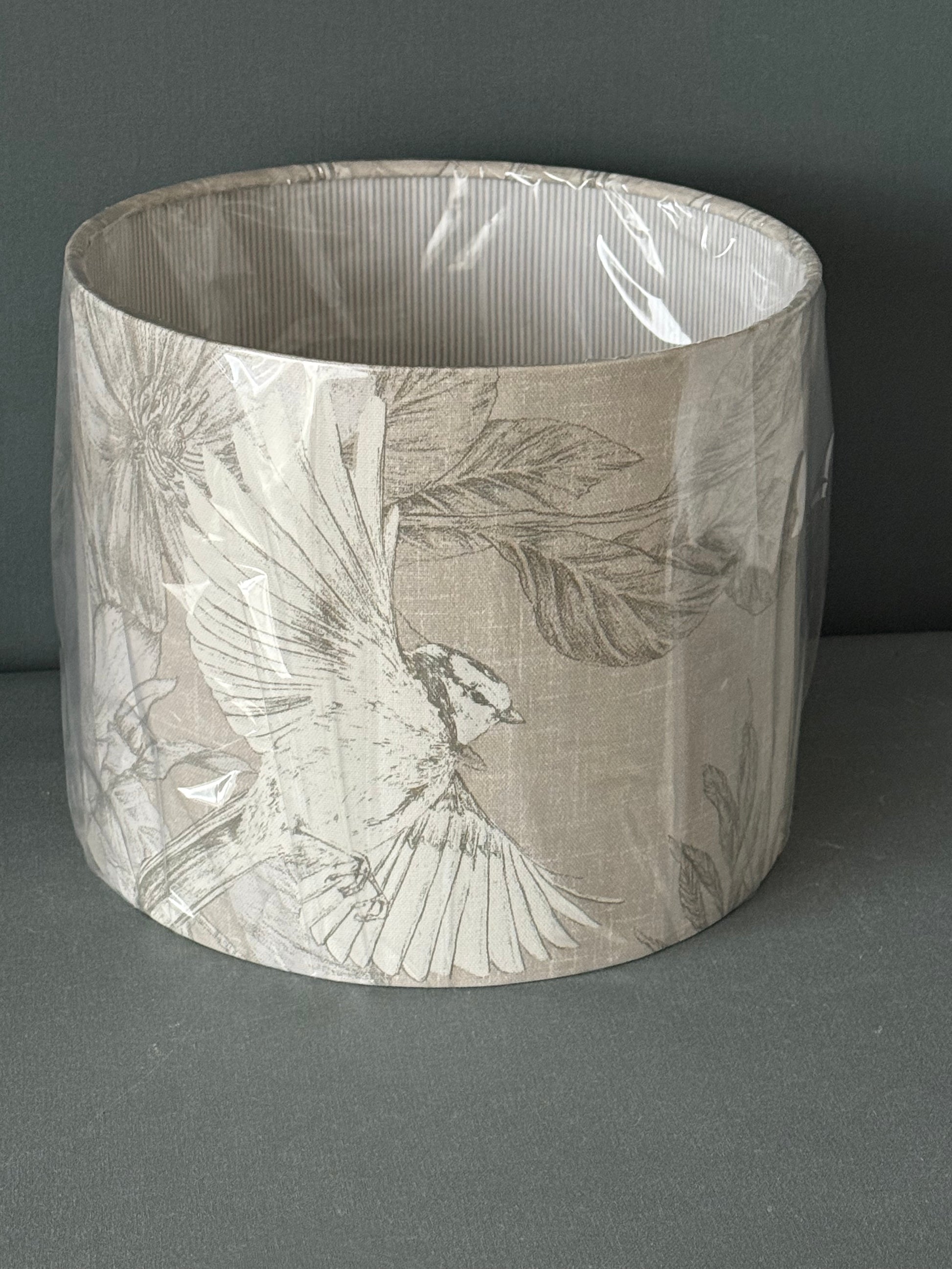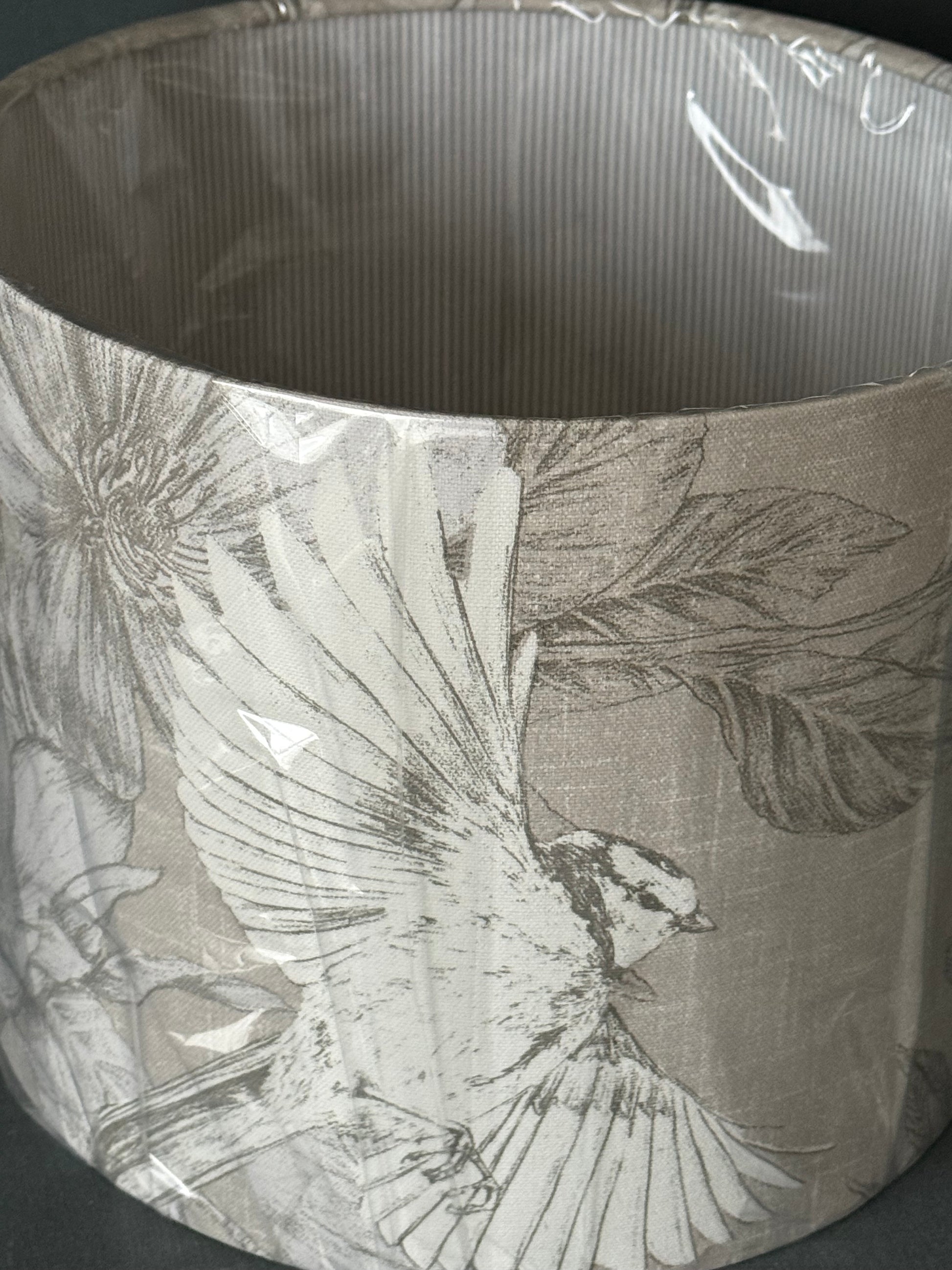 Lampshade 25cm drum lined on the inside with complementary grey strip fabric.