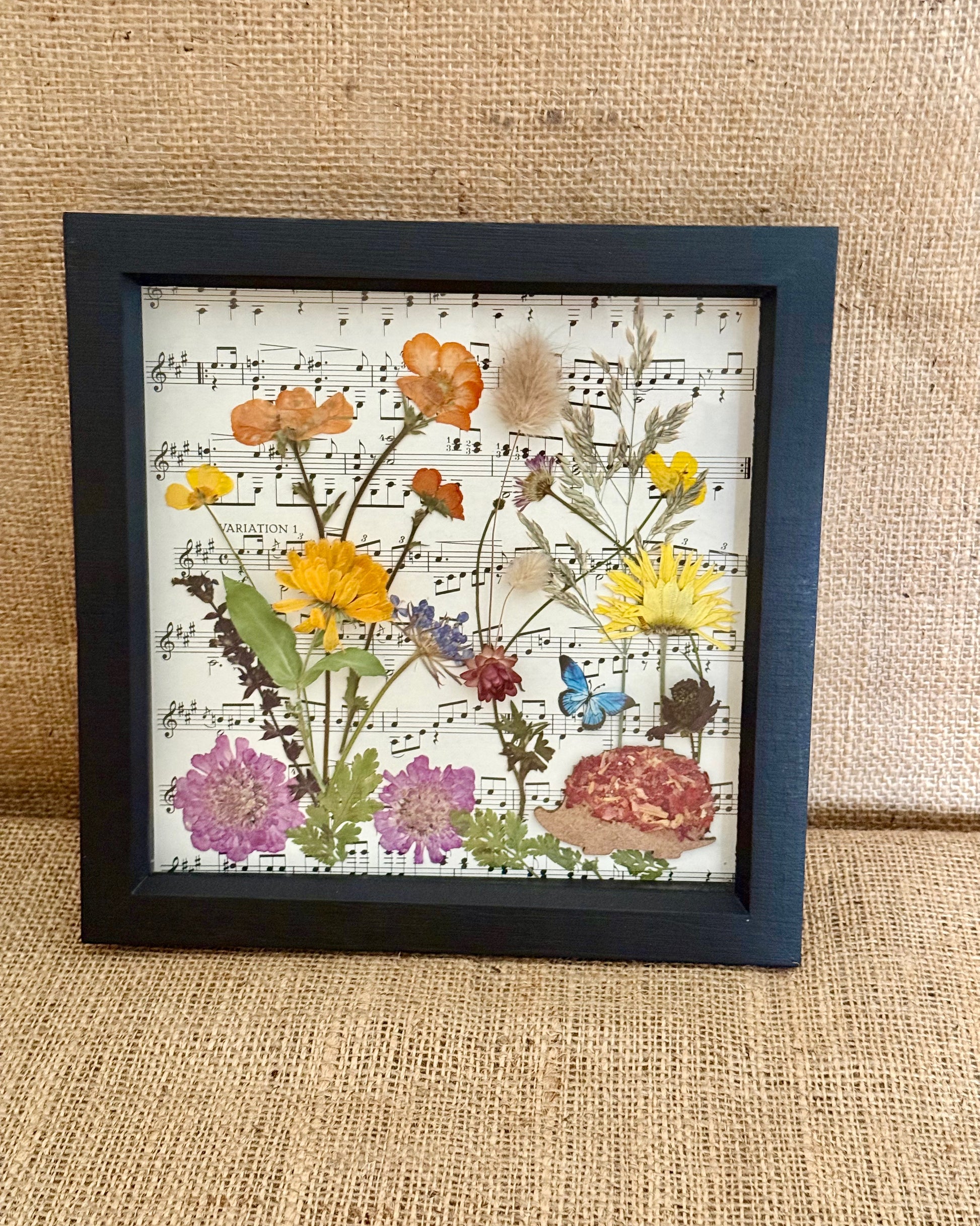 Set against a vintage music manuscript background, this piece brings together a warm, uplifting mix of meadow flowers and soft grasses – featuring scabious, calendula, buttercup, geum, didiscus, bunny tail, erigeron, tufted grass, strawflower and salvia. A delicate butterfly detail adds a sense of movement, and nestled at the bottom is a charming hedgehog – a little tribute to the wildlife we share our farm with.
