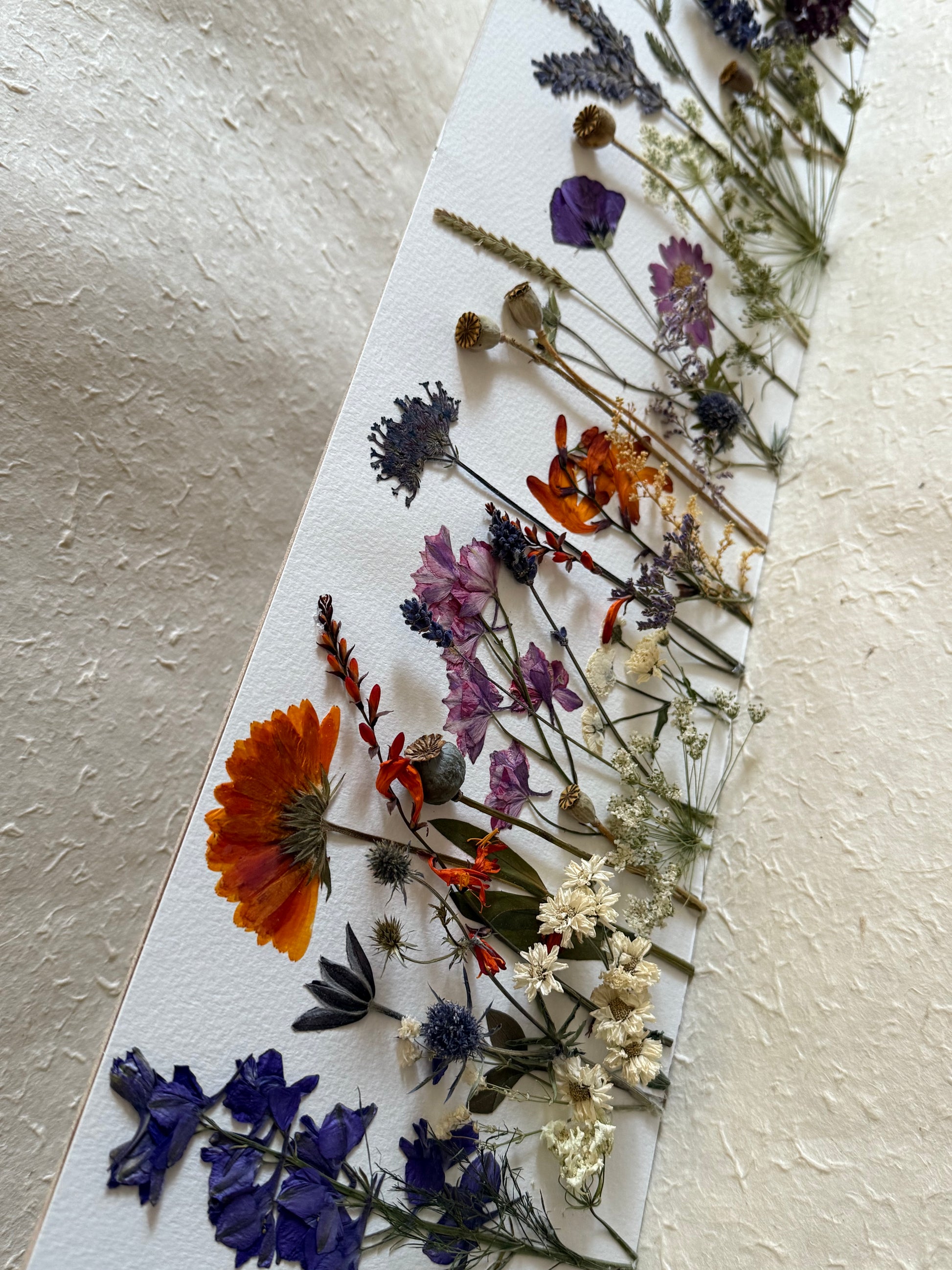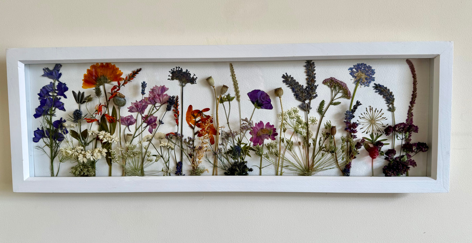 Discover 'Summer Meadow' - a stunning botanical artwork handcrafted by Jeanette using organically grown, seasonal Scottish flowers from our own flower field. Each piece captures the essence of a vibrant summer meadow through carefully slow-pressed stems and traditionally dried flowers, creating a captivating 3D effect that brings nature's beauty into your home.
