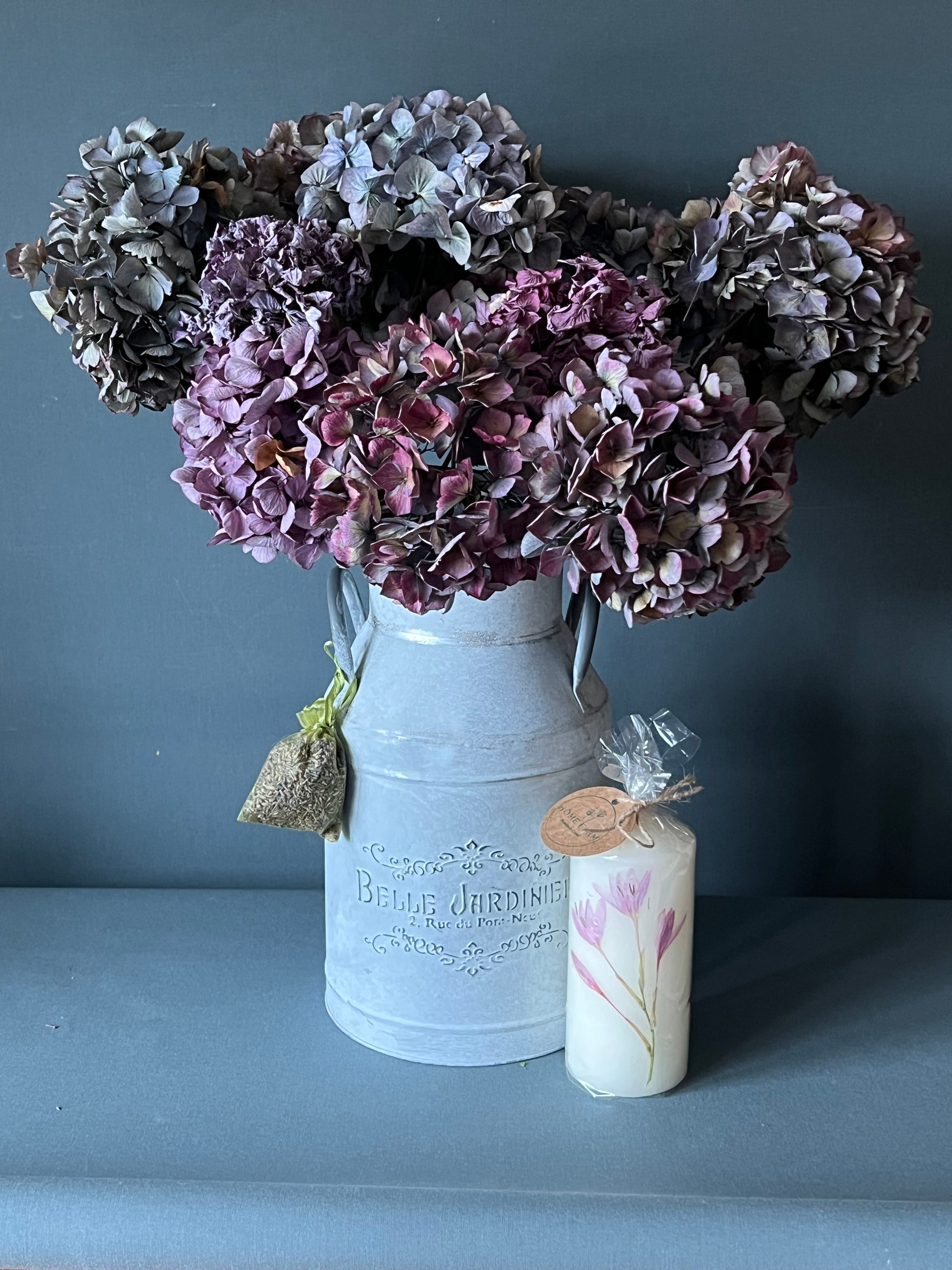 Our luxury dried flower hydrangea combination includes a large mixed bunch of our own home grown & dried hydrangeas in a beautiful zinc display vase. This combination includes one of our gorgeous medium hand made botanical candles and a sachet of our home grown lavender.