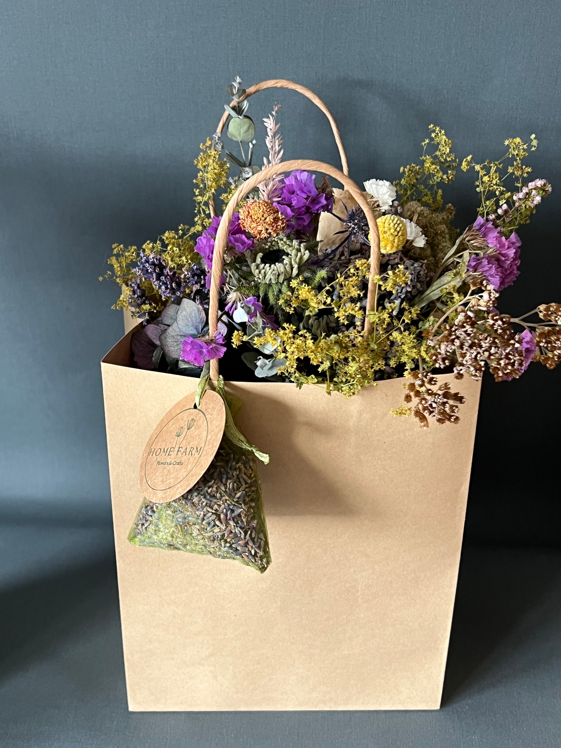 Our home grown, traditionally dried flower posy bags are an ideal gift: a small dried posy in a paper carry bag and includes a lovely scented lavender sachet.