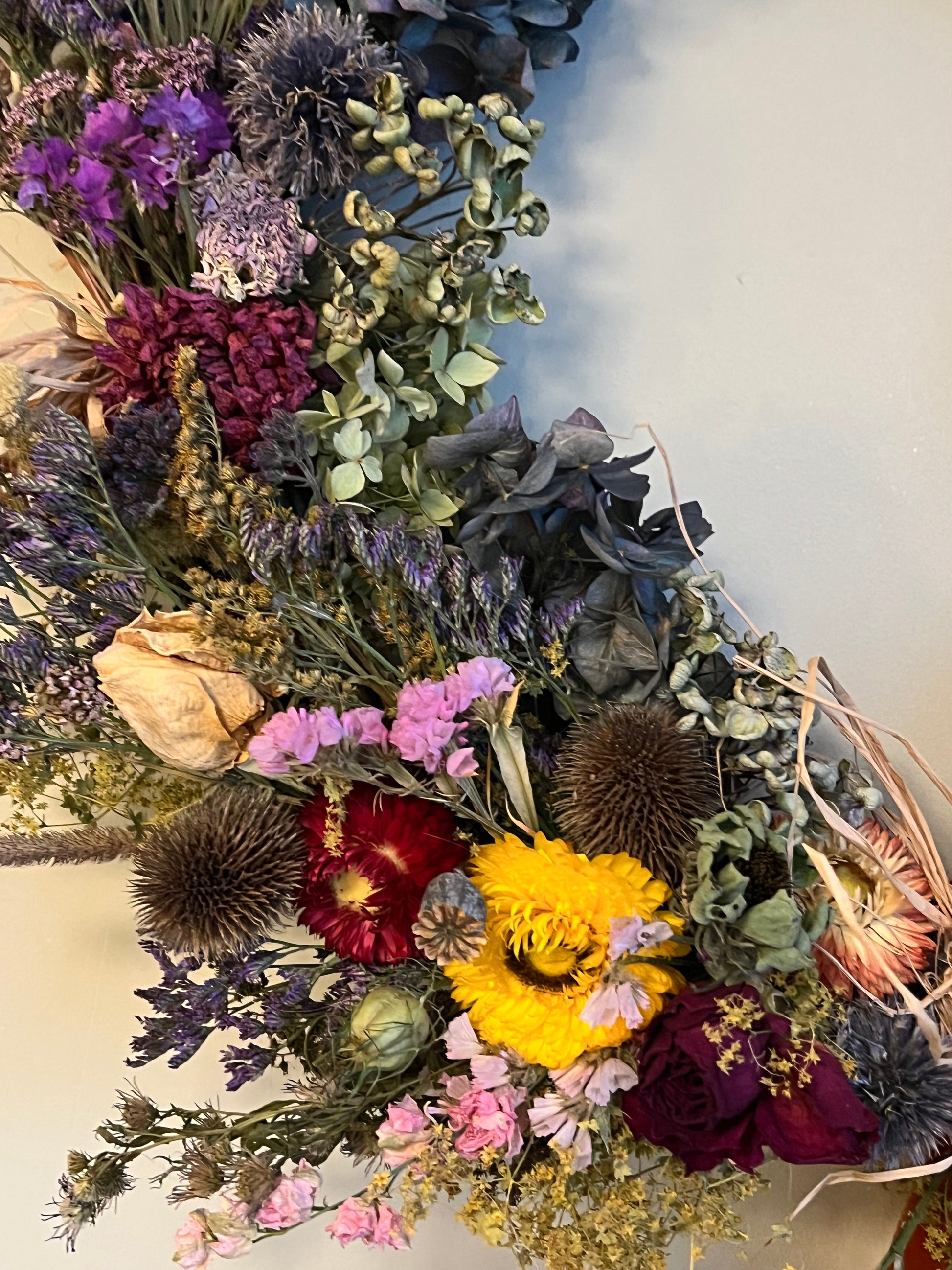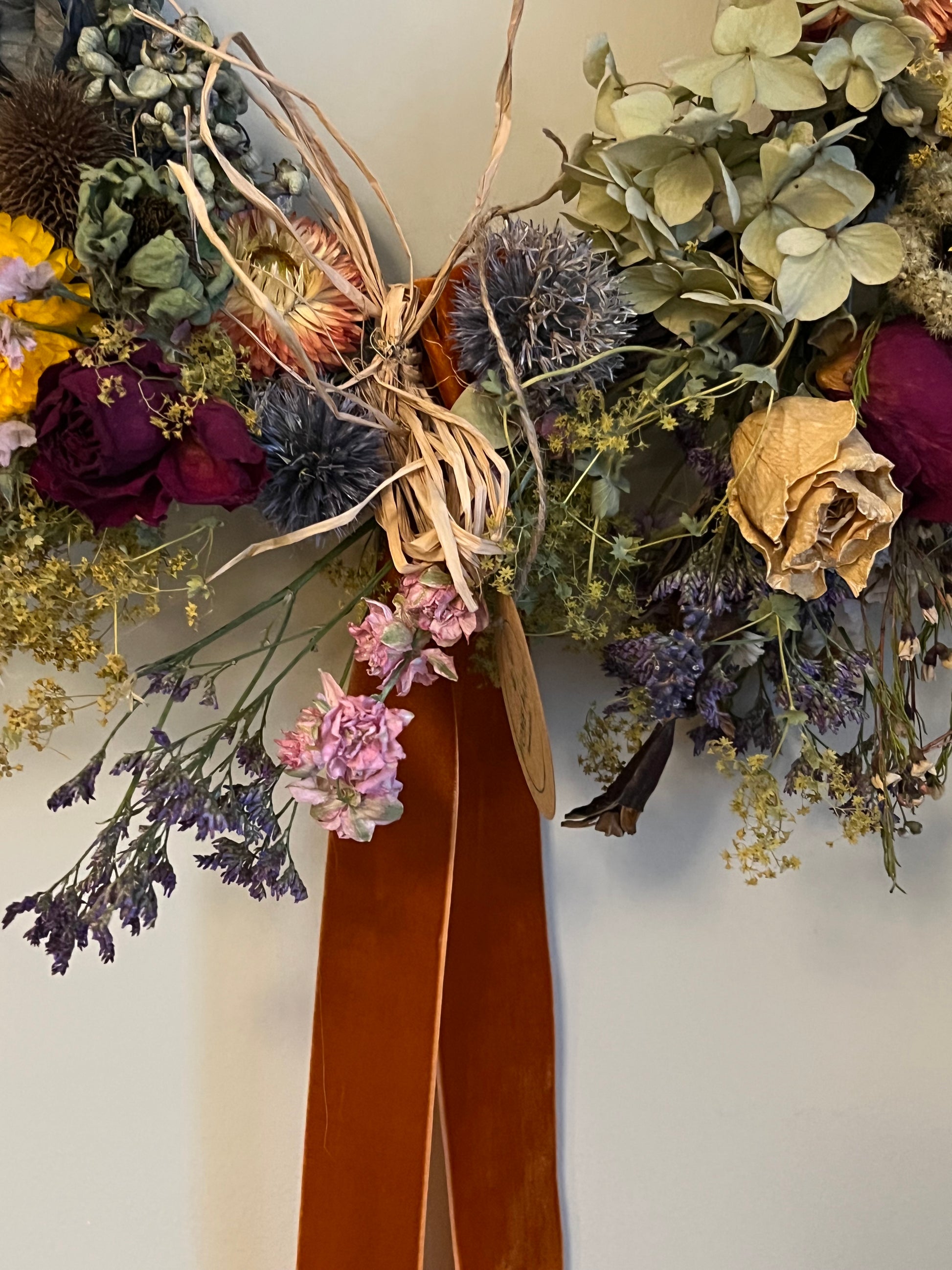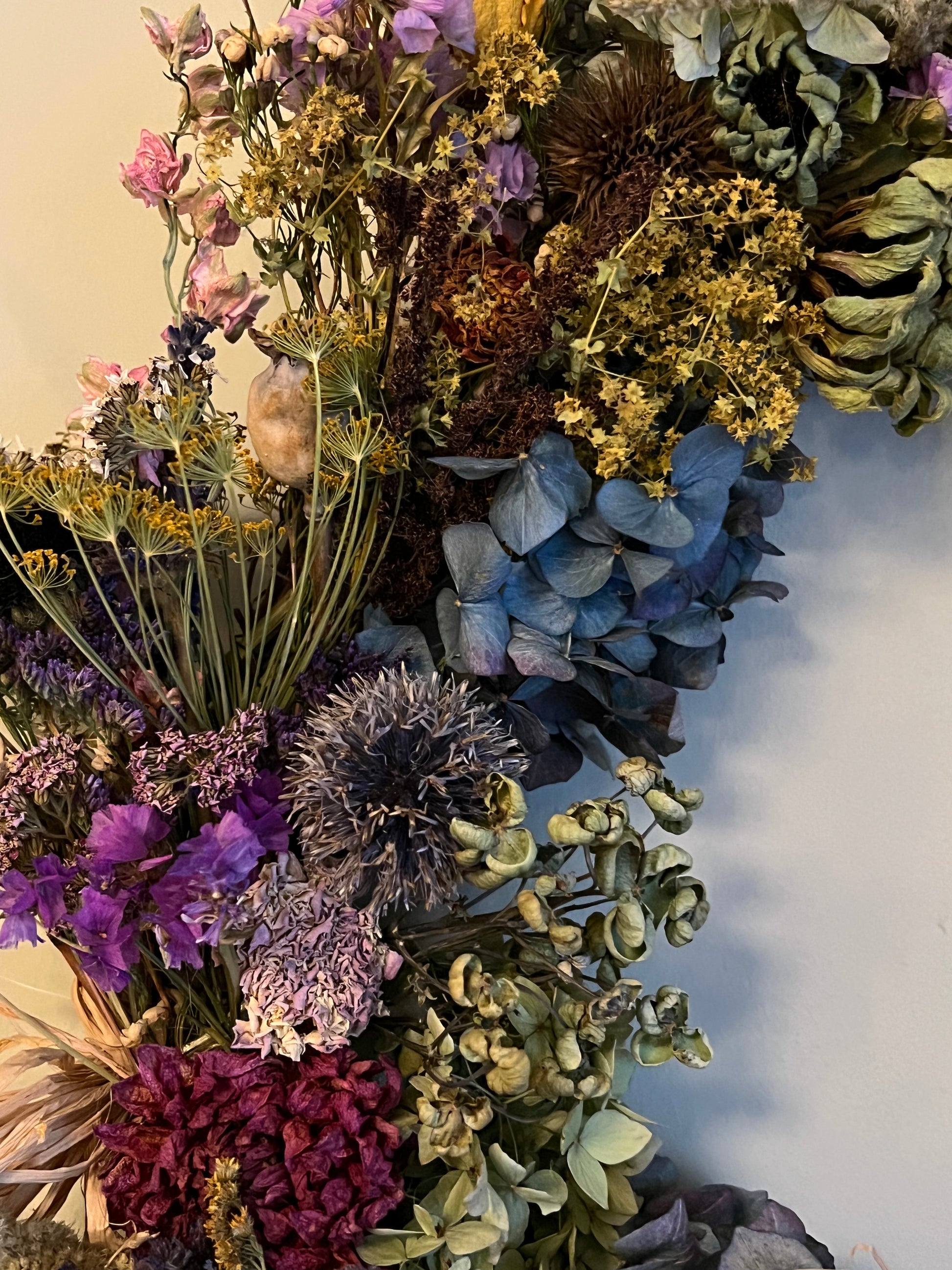 Our luxury wreath includes Achillia, Amaranth, Aster, Bells of Ireland, Dahalia, Eryngium, Grasses, Hydrangea, Iris Seed Heads, Lady’s Mantle, Lavender, Larkspur, Limonium, Nigella, Poppy Seed Heads, Roses, Statice, Strawflowers.