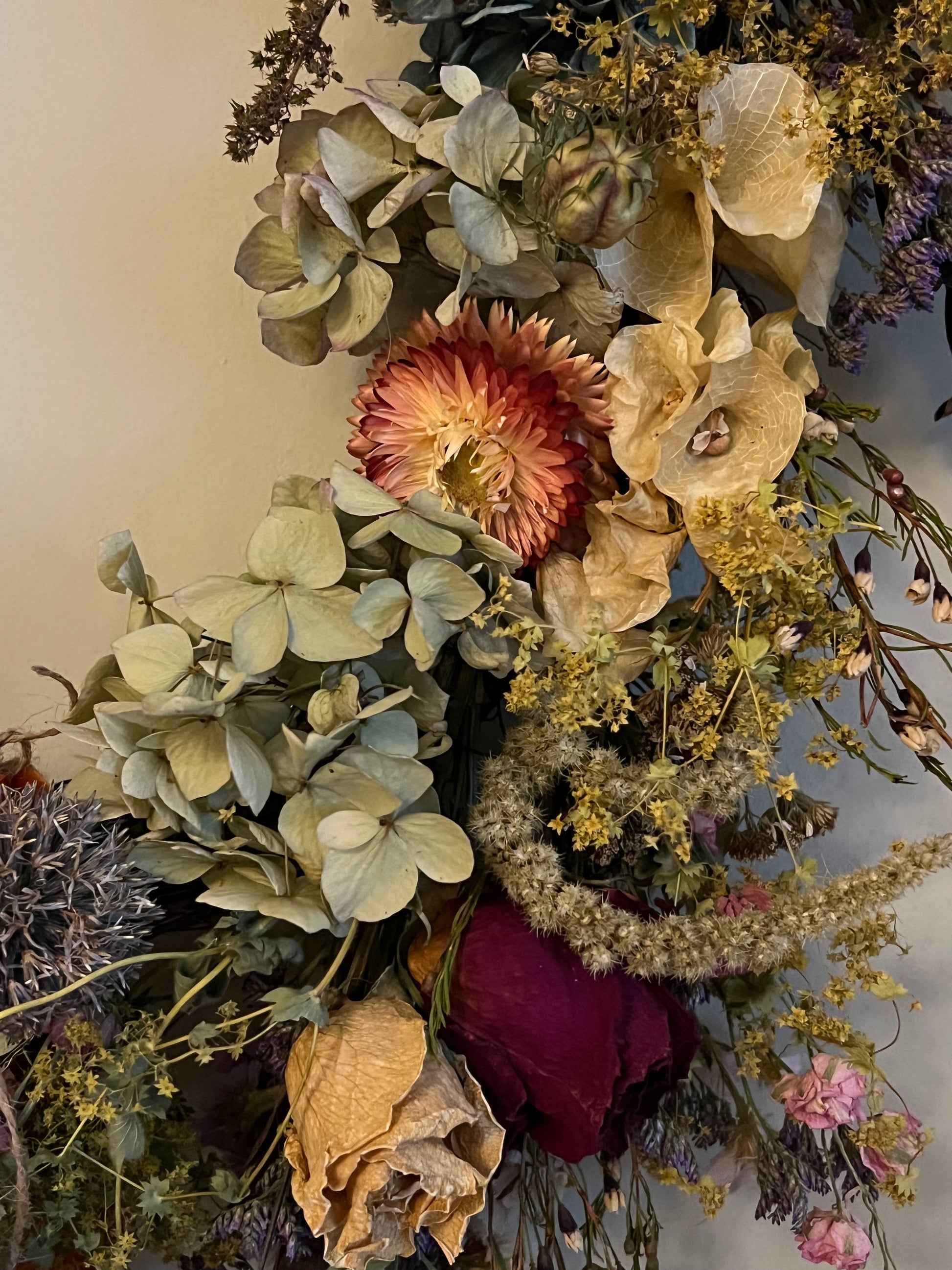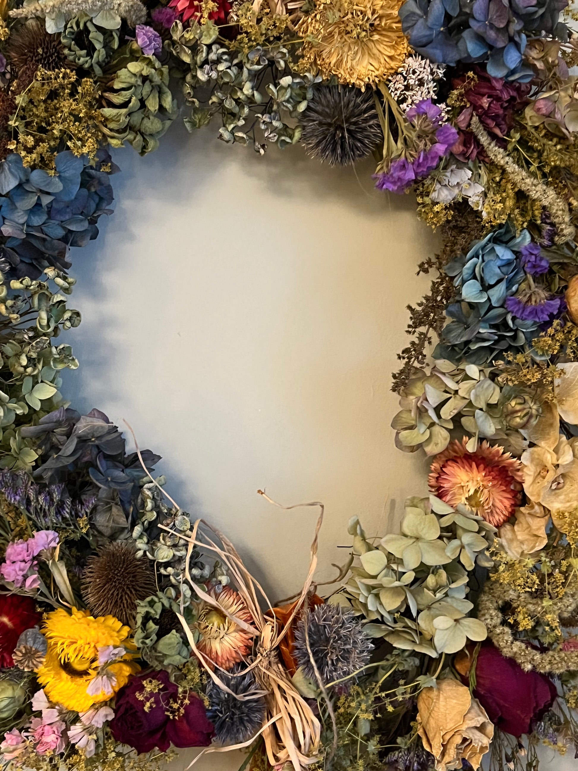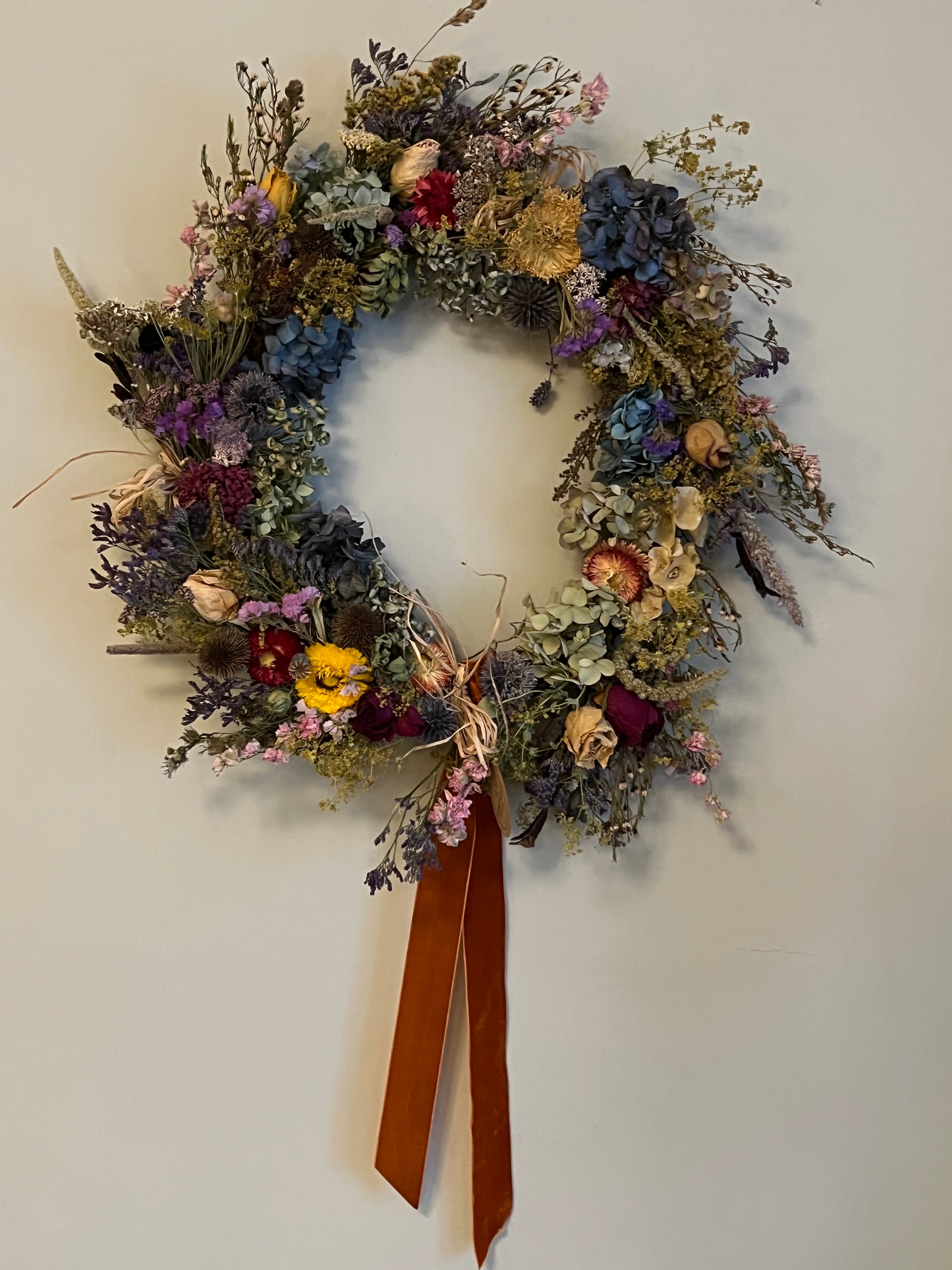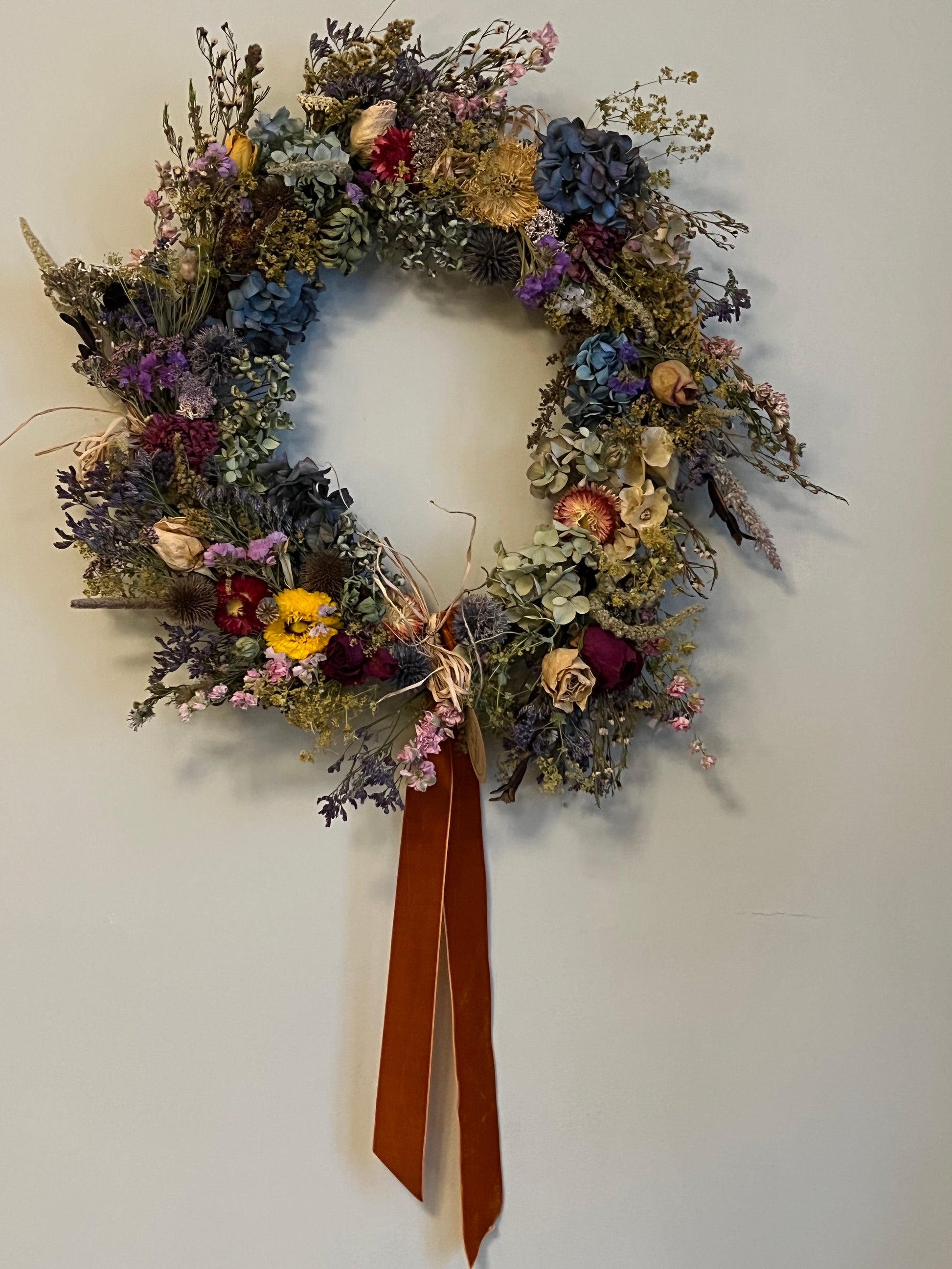 Our luxury wreath includes Achillia, Amaranth, Aster, Bells of Ireland, Dahalia, Eryngium, Grasses, Hydrangea, Iris Seed Heads, Lady’s Mantle, Lavender, Larkspur, Limonium, Nigella, Poppy Seed Heads, Roses, Statice, Strawflowers.