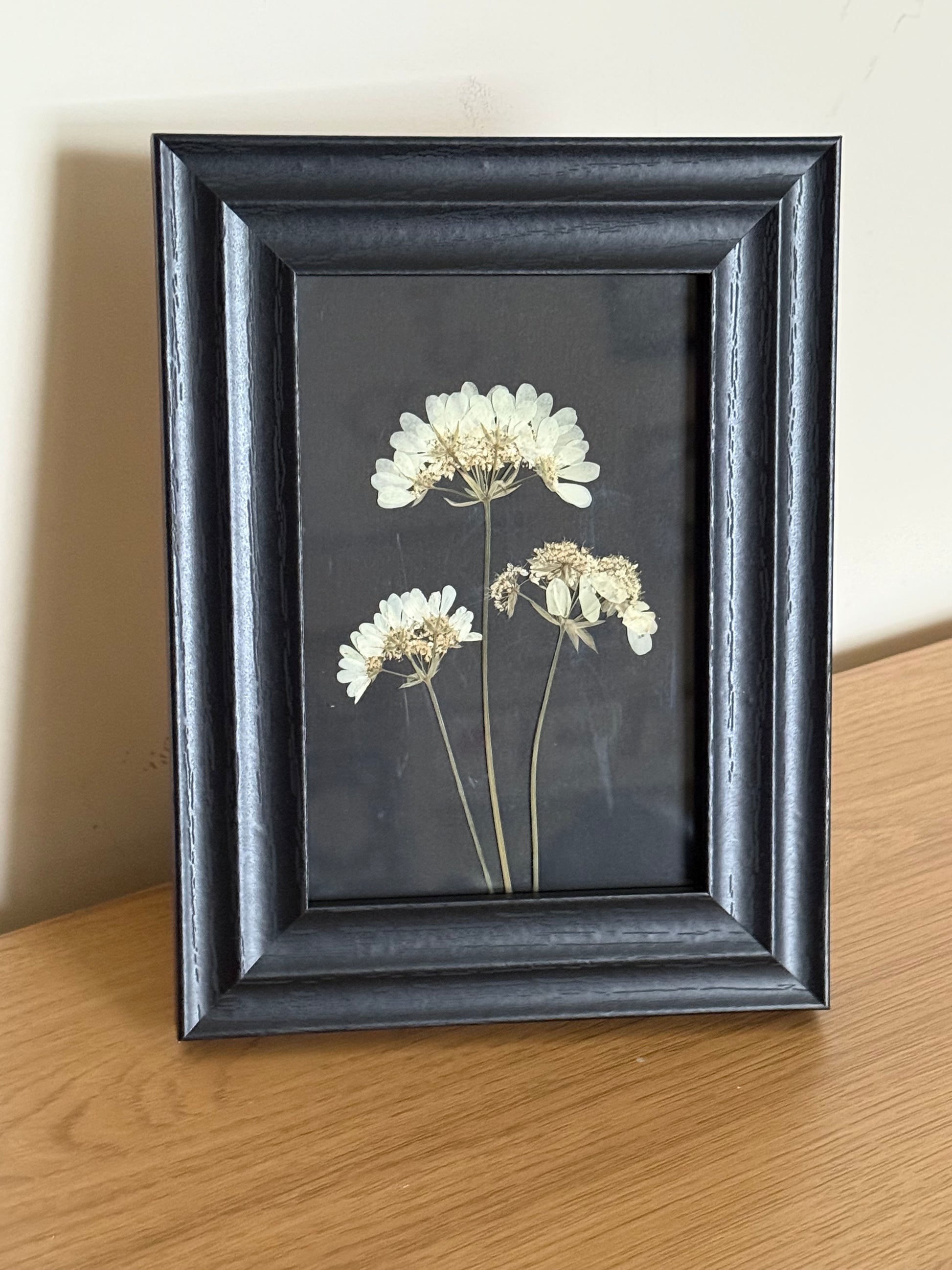 Handcrafted at our Scottish flower farm and presented in a black frame (15cm x 20cm) against a dramatic black background, this piece celebrates the natural architecture and quiet elegance of this stunning bloom.